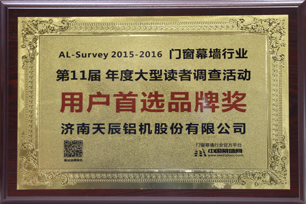 同期,由中國建筑金屬結(jié)構協(xié)會主辦,中國幕墻網(wǎng)承辦的“第十一屆AL-Survey2015-2016中國幕墻網(wǎng)年度大型讀者調(diào)查評選活動”頒獎儀式在在廣州廣交會威斯汀酒店隆重舉行,天辰股份榮獲“用戶首選品牌獎”。