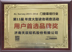 ???? 同期,由中國建筑金屬結構協會主辦,中國幕墻網承辦的“第十一屆AL-Survey2015-2016中國幕墻網年度大型讀者調查評選活動”頒獎儀式在在廣州廣交會威斯汀酒店隆重舉行,天辰股份榮獲“用戶首選品牌獎”。